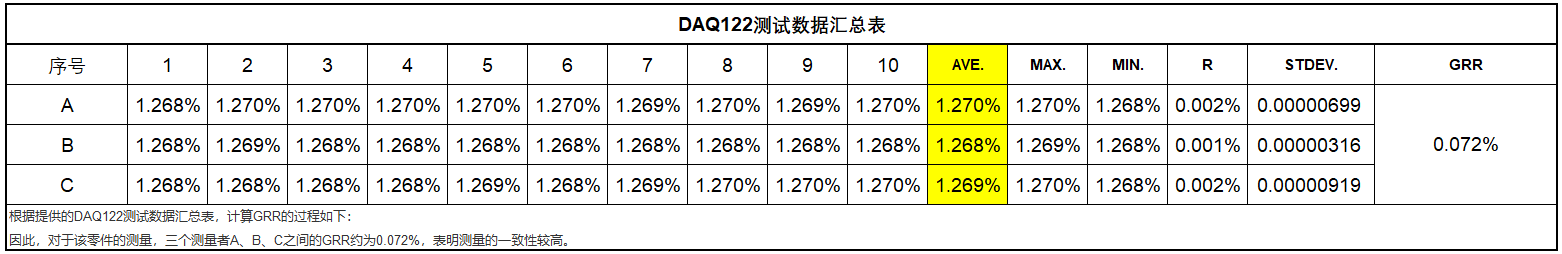 Aby upewnić się, że wybrana karta do gromadzenia danych spełnia wymagania, zespół ME przetestował ją. Analiza pokazuje, że wybrana karta do gromadzenia danych charakteryzuje się doskonałą stabilnością, z GRR wynoszącym około 0,072% wśród trzech mierników A, B i C.