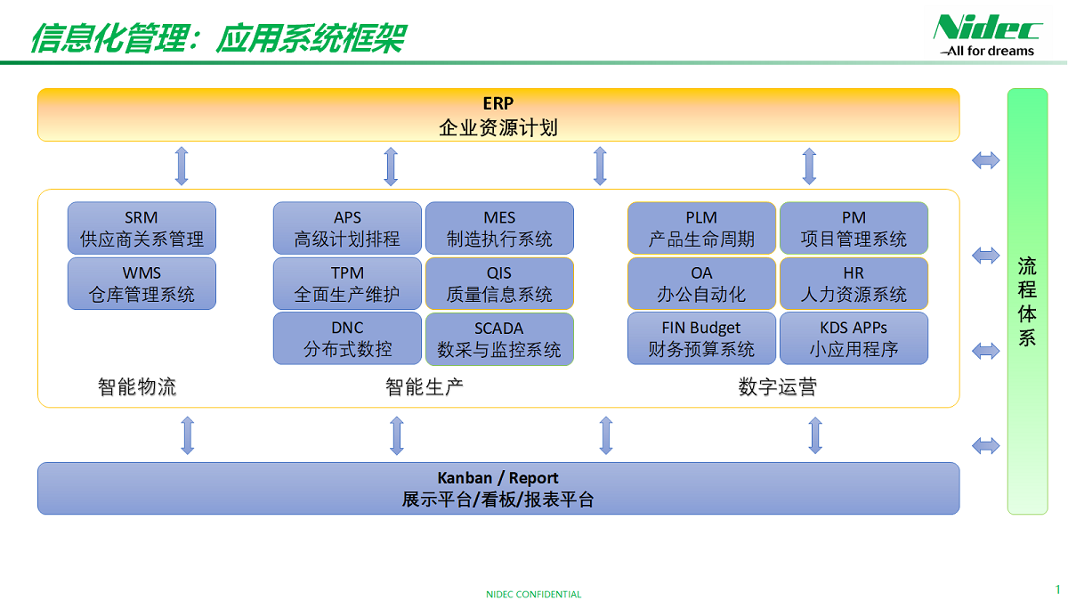 Firma Nidec Elevator Motors niezależnie opracowała takie systemy, jak SRM (zarządzanie relacjami z dostawcami), MES (system realizacji produkcji), APS (zaawansowane planowanie i harmonogramowanie), WMS (system zarządzania magazynem) i TPM (całkowite utrzymanie produktu). Buduje cały inteligentny system produkcyjny poprzez automatyzację, cyfryzację, modelowanie, wizualizację, integrację i inteligencję, umożliwiając realizację zrównoważonego harmonogramu produkcji i elastycznej inteligentnej produkcji oraz kładąc solidne podstawy pod przyszłą realizację „fabryki latarni morskiej”.